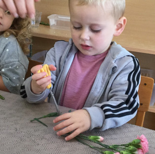On returning to the nursery the all important task of preparing the flowers before the arranging begins. After opening the packaging, the children trim the stems so the flower can drink and live longer. They arrange the flowers in the glass vases and decide where to put them in the nursery. The learning that takes place naturally and through discussions with friends and practitioners is amazing. The children are learning how to handle scissors, the names of the flowers, parts of a flower, colours and much more.
